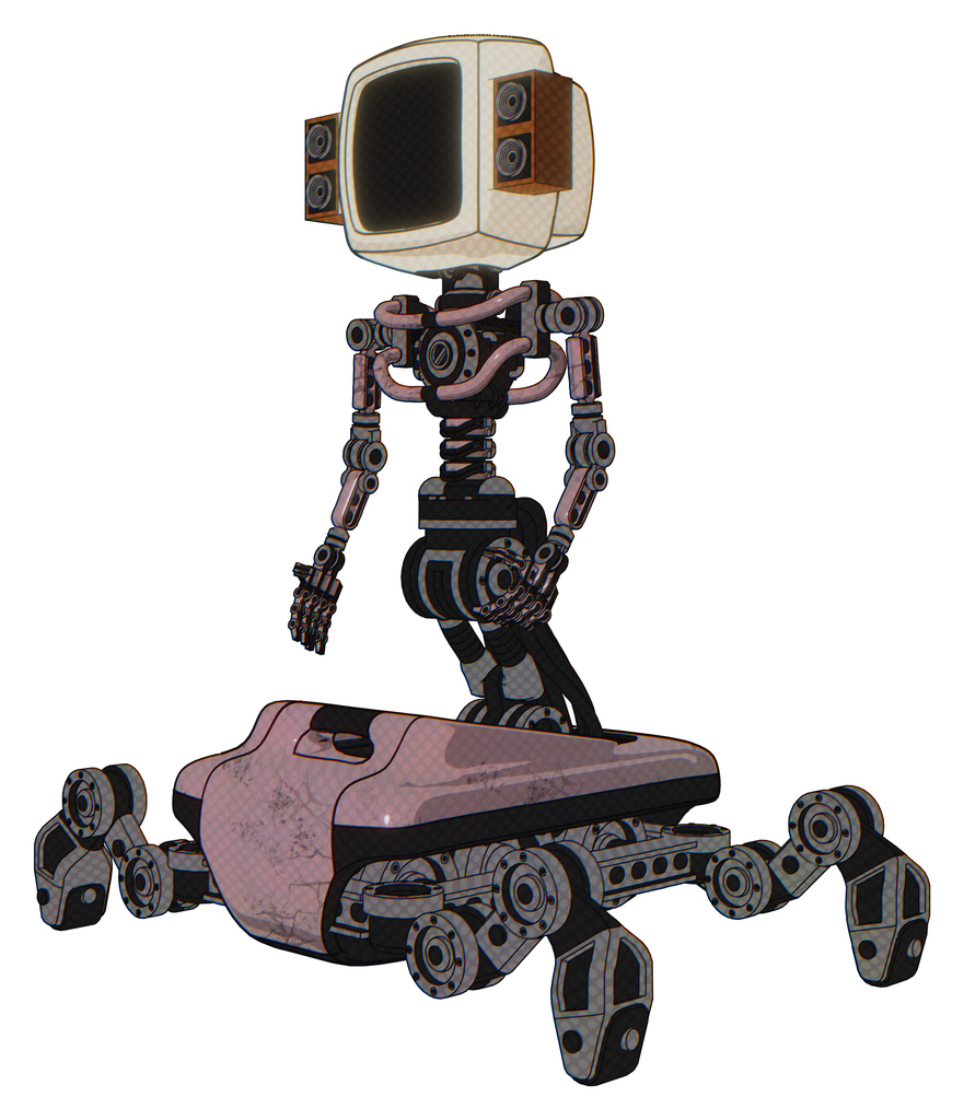 Cyborg containing old computer monitor and old retro speakers and light chest exoshielding and no chest plating and insect walker legs. Grayish pink. Facing right view.