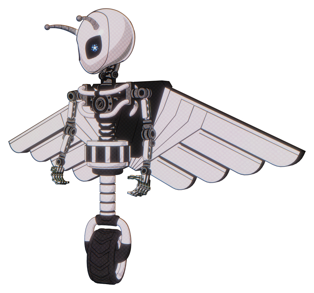 Mech containing grey alien style head and electric eyes and bug antennas and light chest exoshielding and pilot's wings assembly and no chest plating and unicycle wheel. White halftone toon.