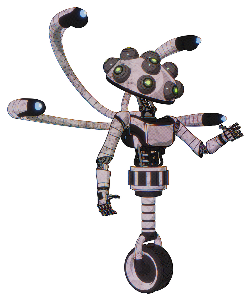 Mech containing many robo-eye domehead design and light chest exoshielding and ultralight chest exosuit and blue-eye cam cable tentacles and unicycle wheel. Sketch pad dirty smudge. Interacting.