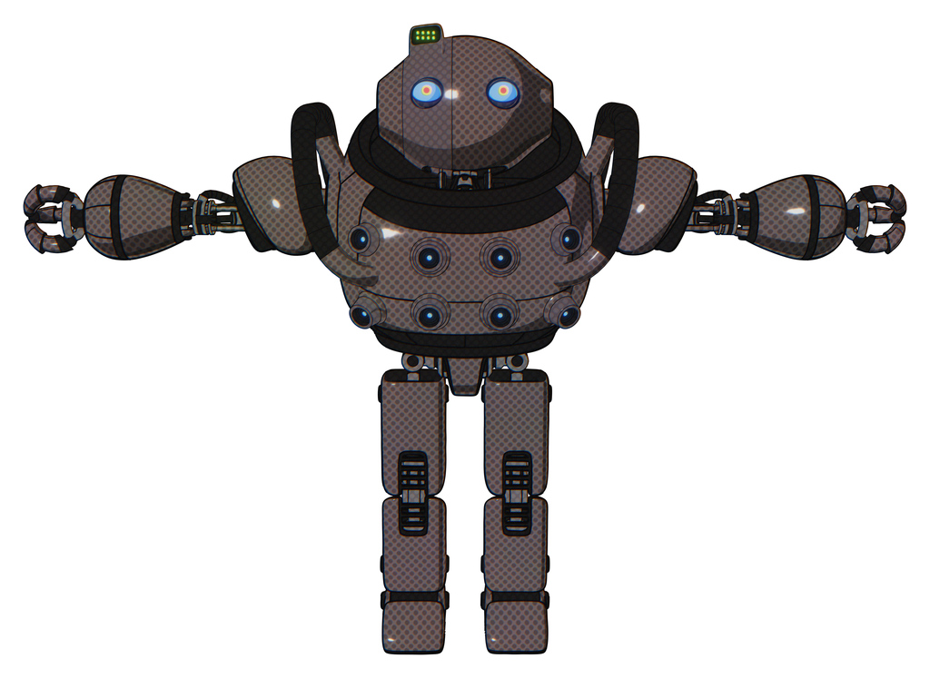 Robot containing oval wide head and blue eyes and green led ornament and heavy upper chest and chest energy sockets and prototype exoplate legs. Light brown. T-pose.