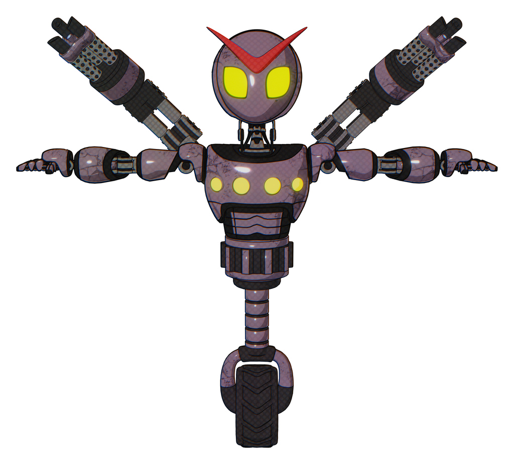 Automaton containing grey alien style head and yellow eyes and light chest exoshielding and yellow chest lights and minigun back assembly and unicycle wheel. Lilac metal. T-pose.