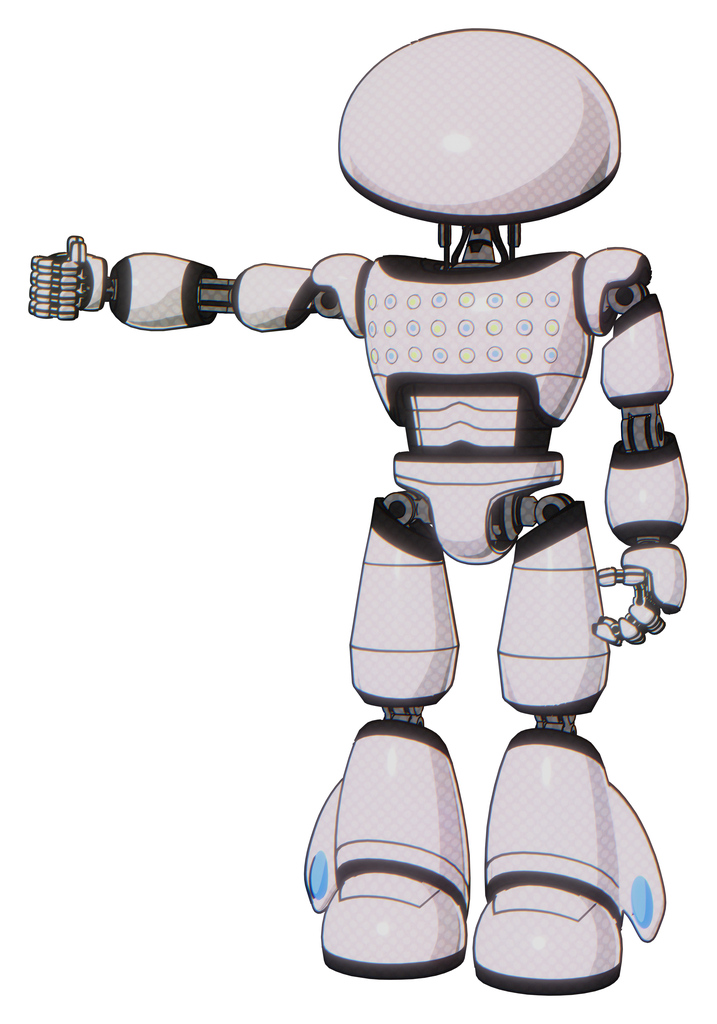 Robot containing dome head and light chest exoshielding and chest green blue lights array and light leg exoshielding. White halftone toon. Arm out holding invisible object..