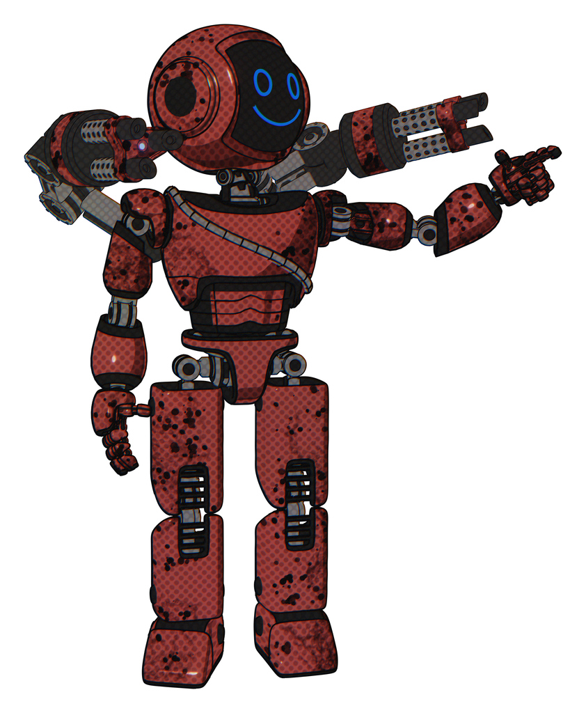 Automaton containing digital display head and happy face and light chest exoshielding and cable sash and minigun back assembly and prototype exoplate legs. Grunge matted orange.