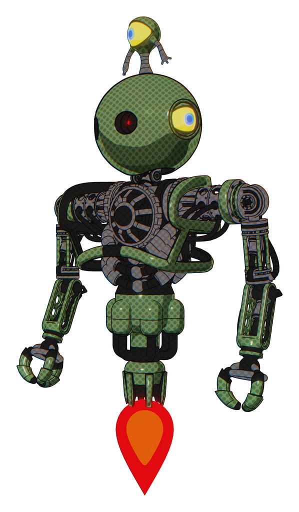 Bot containing oval wide head and small red led eyes and minibot ornament and heavy upper chest and no chest plating and jet propulsion. Grass green. Standing looking right restful pose.