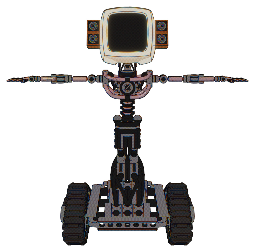 Cyborg containing old computer monitor and old retro speakers and light chest exoshielding and no chest plating and tank tracks. Grayish pink. T-pose.
