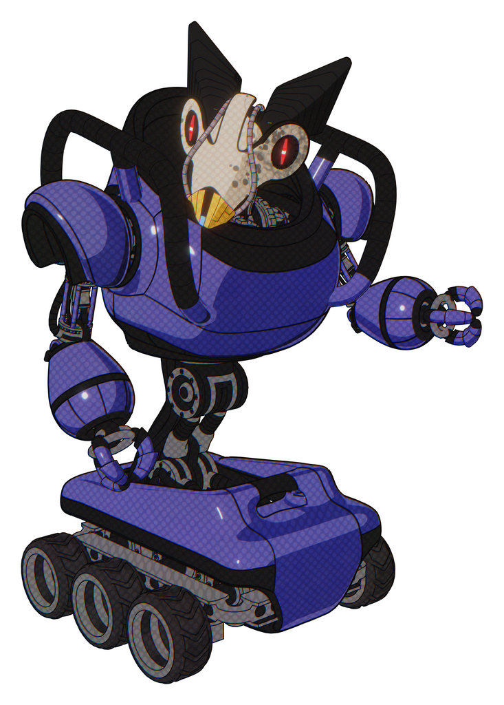 Robot containing bird skull head and red line eyes and robobeak design and heavy upper chest and six-wheeler base. Primary blue halftone. Fight or defense pose..
