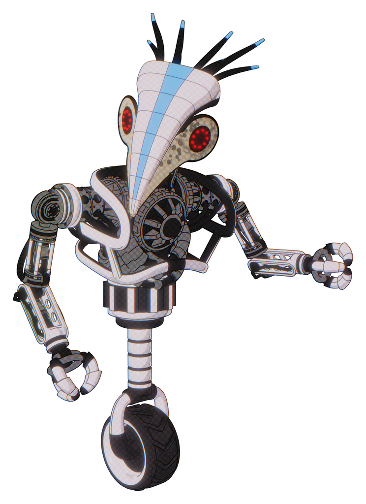 Bot containing bird skull head and red led circle eyes and head shield design and heavy upper chest and no chest plating and unicycle wheel. White halftone toon. Fight or defense pose..