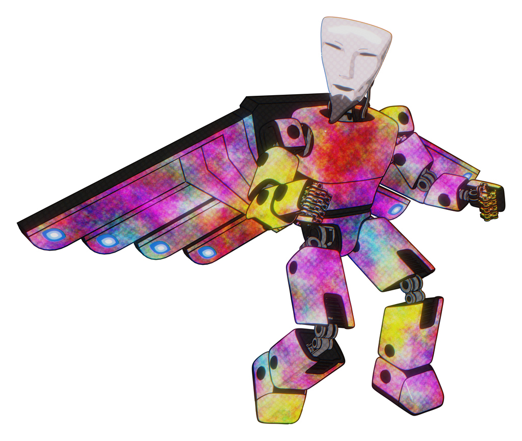 Mech containing humanoid face mask and light chest exoshielding and prototype exoplate chest and cherub wings design and prototype exoplate legs. Plasma burst. Fight or defense pose..