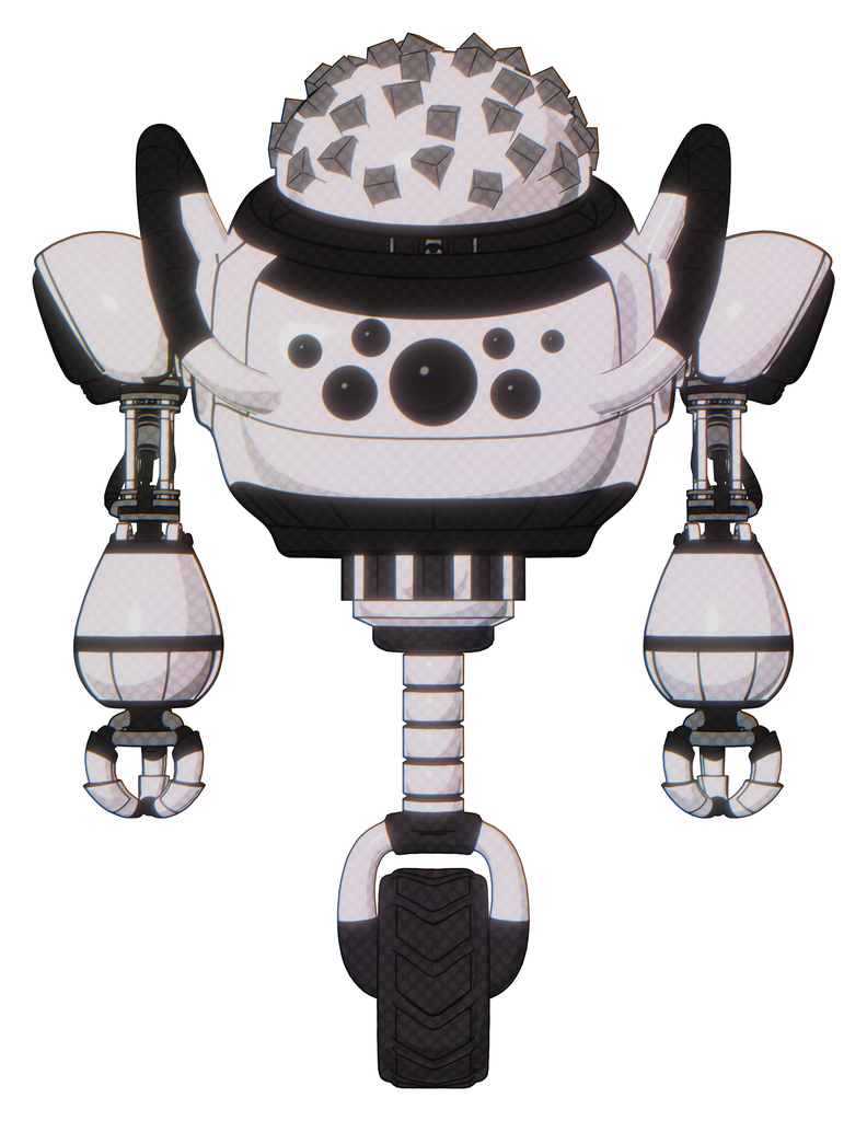 Mech containing metal cubes dome head design and heavy upper chest and chest compound eyes and unicycle wheel. White halftone toon. Front view.