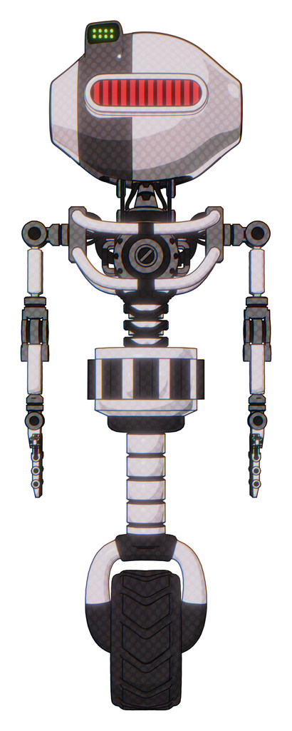 Cyborg containing oval wide head and red horizontal visor and green led ornament and light chest exoshielding and no chest plating and unicycle wheel. White halftone toon. Front view.