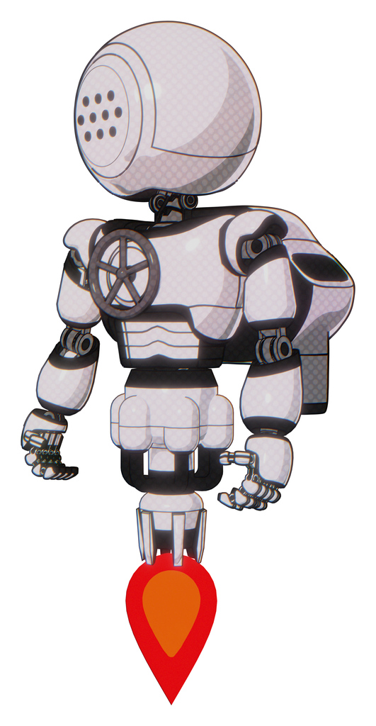 Cyborg containing dots array face and light chest exoshielding and chest valve crank and rocket pack and jet propulsion. White halftone toon. Standing looking right restful pose.