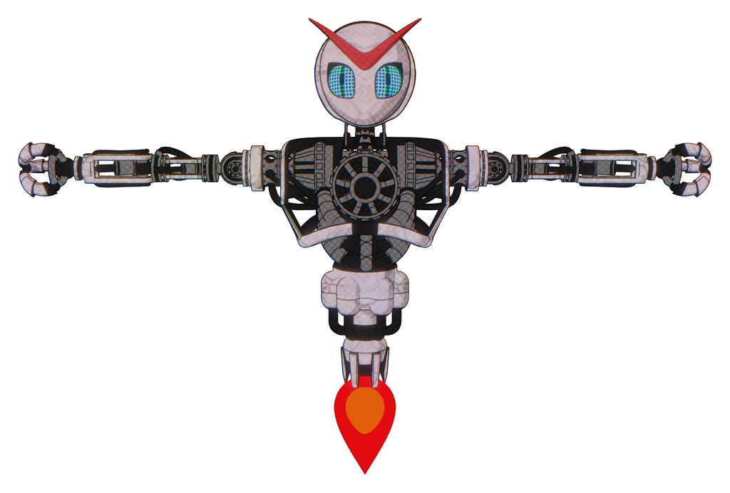 Robot containing grey alien style head and blue grate eyes and heavy upper chest and no chest plating and jet propulsion. Sketch pad light. T-pose.