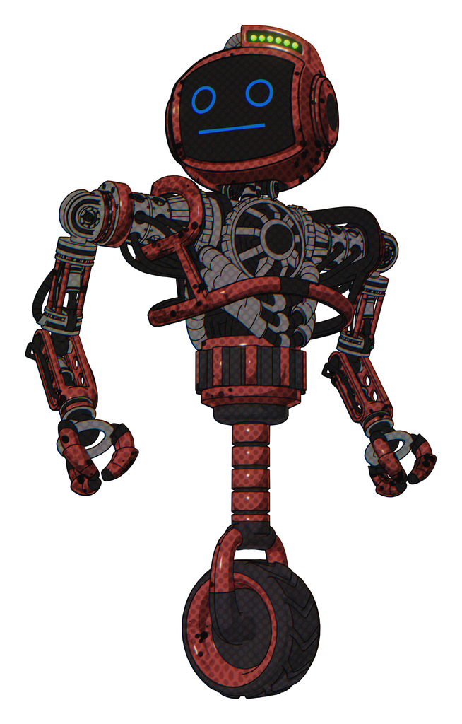 Cyborg containing digital display head and blank-faced expression and green led array and heavy upper chest and no chest plating and unicycle wheel. Grunge matted orange. Hero pose.