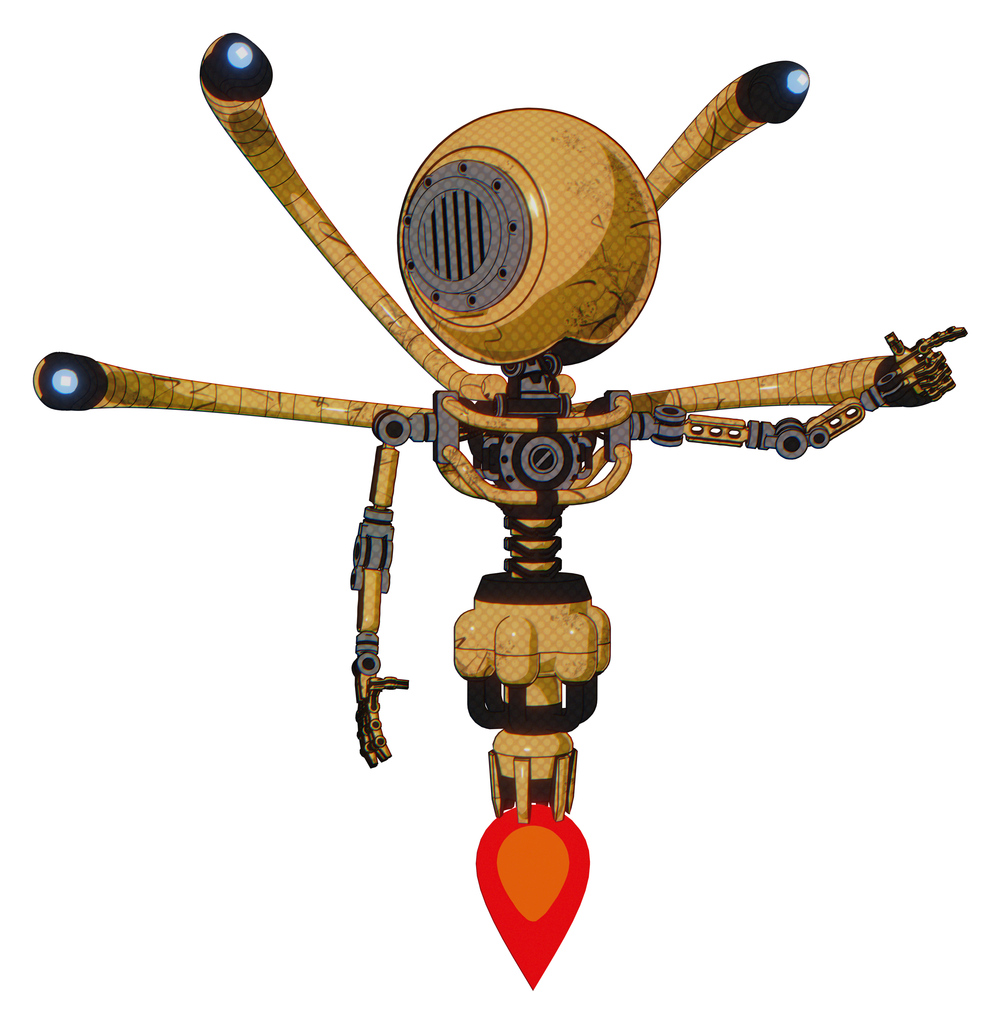 Droid containing round head and light chest exoshielding and blue-eye cam cable tentacles and no chest plating and jet propulsion. Construction yellow halftone. Pointing left or pushing a button..