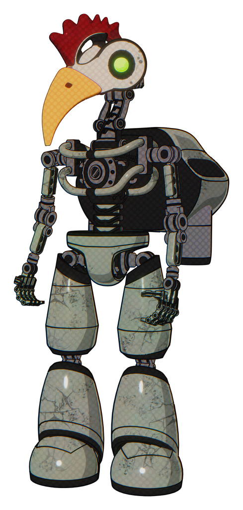Droid containing elements: bird skull head, green eyes, chicken design, light chest exoshielding, rocket pack, no chest plating, light leg exoshielding. Material: Green metal.