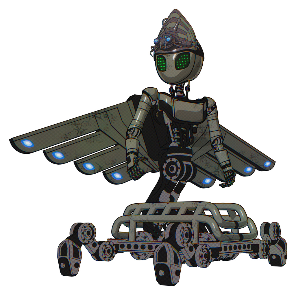 Droid containing grey alien style head and led array eyes and alien bug creature hat and light chest exoshielding and ultralight chest exosuit and cherub wings design and insect walker legs.