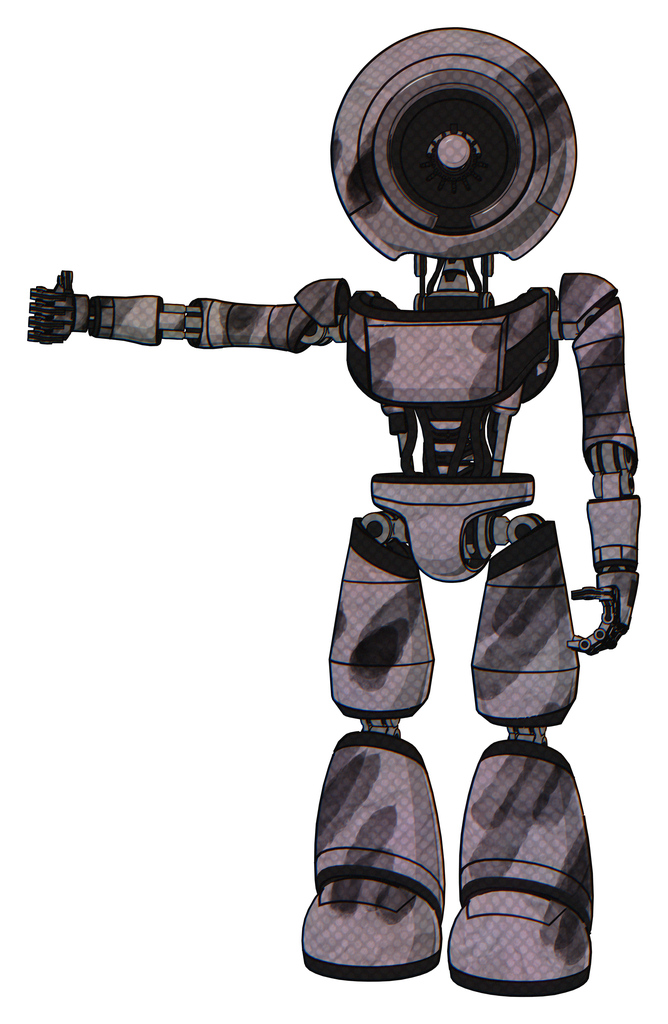 Robot containing cable connector head and light chest exoshielding and ultralight chest exosuit and light leg exoshielding. Sketch pad wet ink smudge. Arm out holding invisible object..