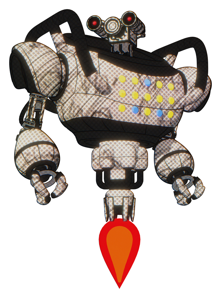 Droid containing dual retro camera head and simple blue telescopic eye head and heavy upper chest and colored lights array and jet propulsion. Halftone sketch. Hero pose.