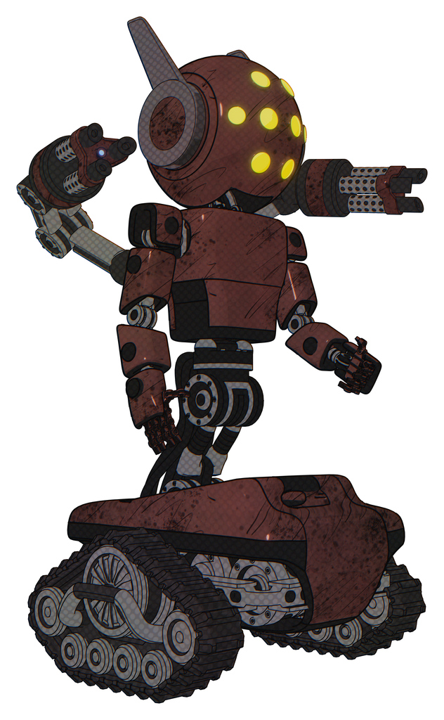 Keywords: Bot, Robot, Minigun, Backpack, Prototype, Light, Automaton, Winglets, Brown, Drawing, Android, Eyes, Left, Tank Tracks, Cg, Head, Steampunk, Ai, Graphic Art, Line Art, Back, Armor, Tracks, Tank, Technology, Exo, Retro, Array, Copper, Illustration, Facing, Yellow, Round, Halftone