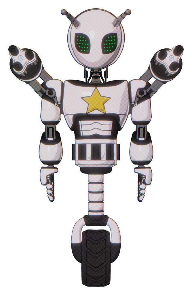 Droid containing grey alien style head and led array eyes and bug antennas and light chest exoshielding and yellow star and minigun back assembly and unicycle wheel. White halftone toon. Front view.