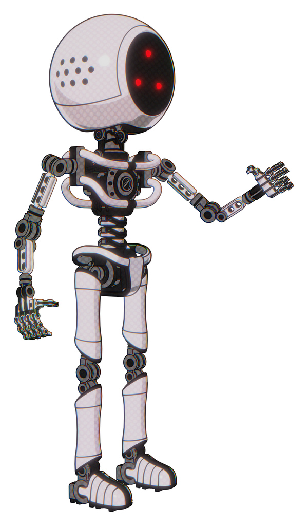 Automaton containing three led eyes round head and light chest exoshielding and no chest plating and ultralight foot exosuit. White halftone toon. Interacting.