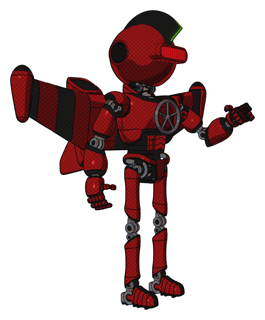 Mech containing oval wide head and red horizontal visor and techno mohawk and light chest exoshielding and chest valve crank and stellar jet wing rocket pack and ultralight foot exosuit. Dark red.