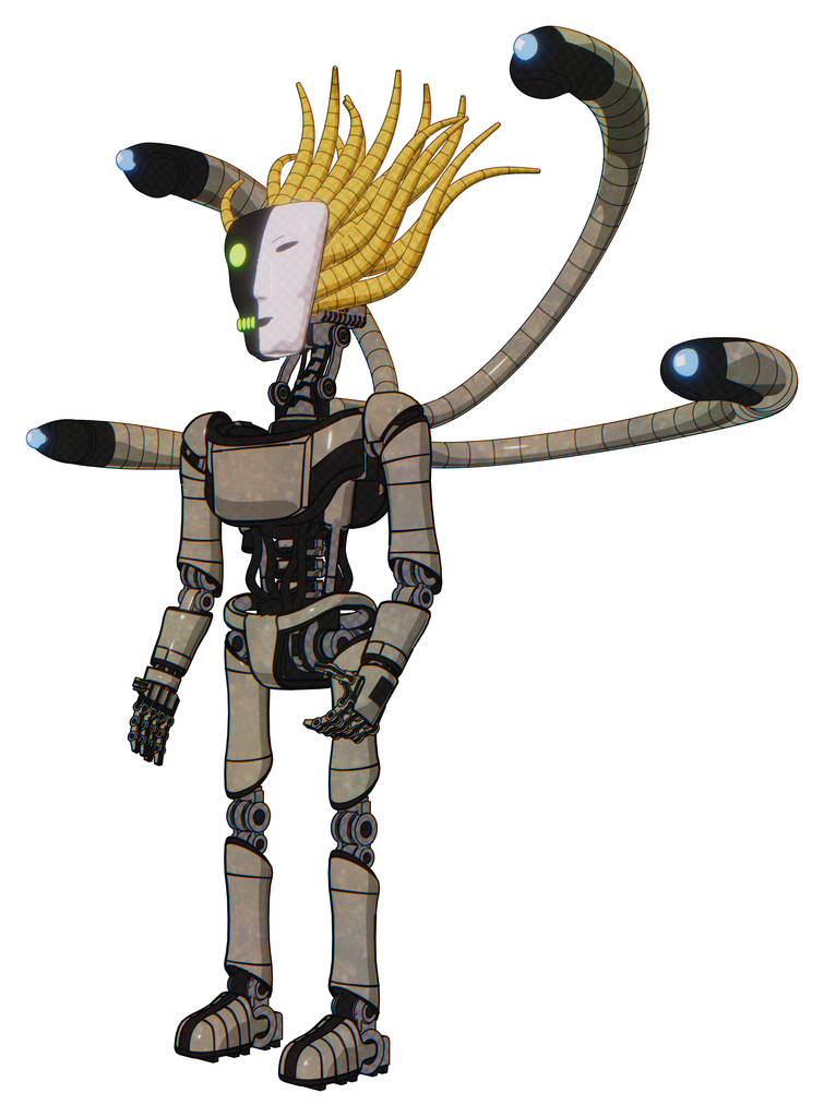 Robot containing humanoid face mask and two-face black white mask and light chest exoshielding and ultralight chest exosuit and blue-eye cam cable tentacles and ultralight foot exosuit.