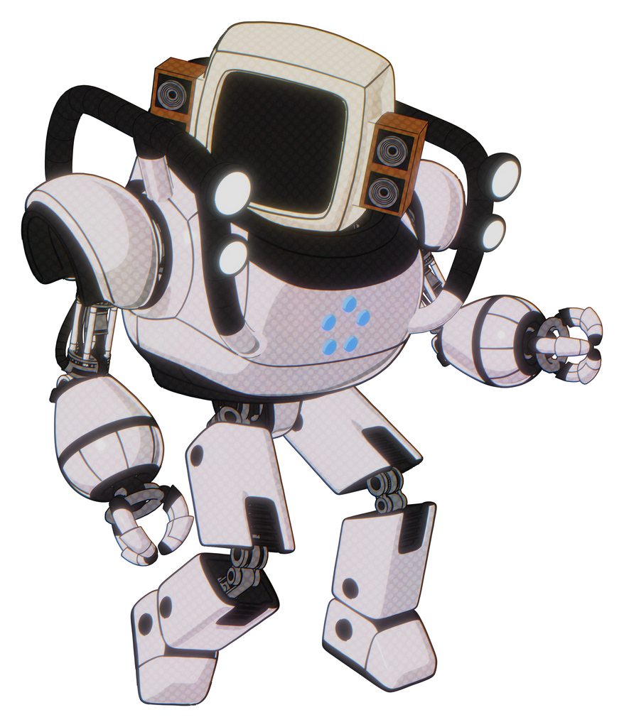 Robot containing old computer monitor and old retro speakers and heavy upper chest and circle of blue leds and shoulder headlights and prototype exoplate legs. White halftone toon.