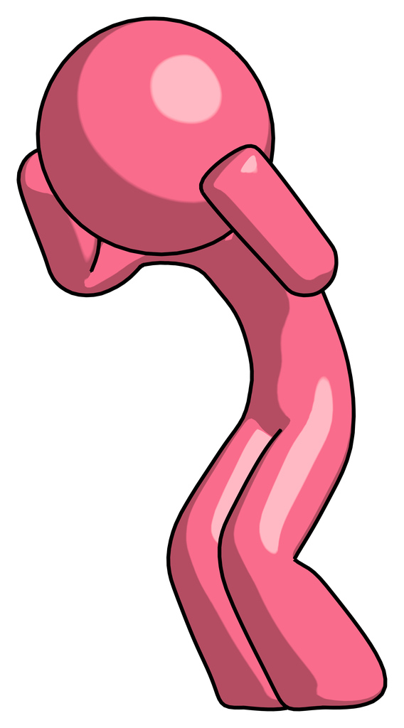 Pink Design Mascot Man with Headache or Covering Ears Turned to His Left