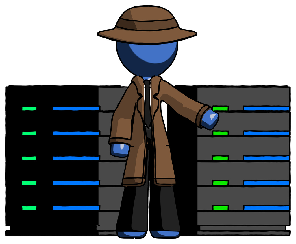 Blue Detective Man With Server Racks, In Front Of Two Networked Systems
