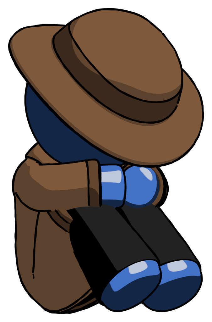 Blue Detective Man Sitting with Head Down Facing Angle Right