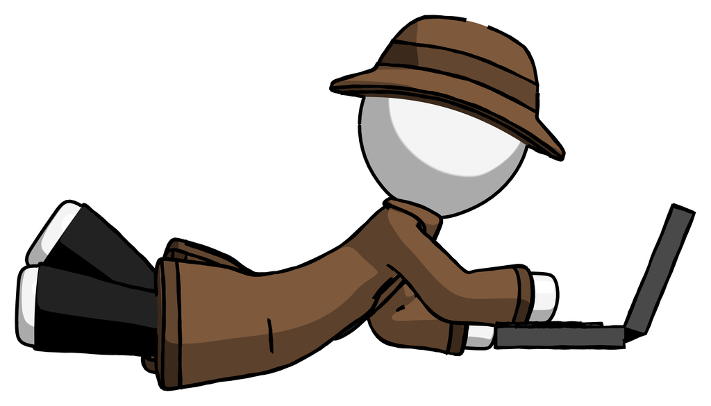 White Detective Man using laptop computer while lying on floor side view