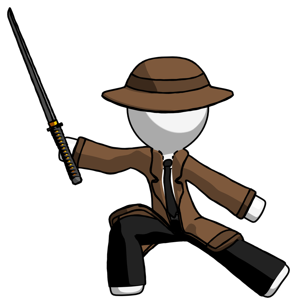 White Detective Man with ninja sword katana in defense pose