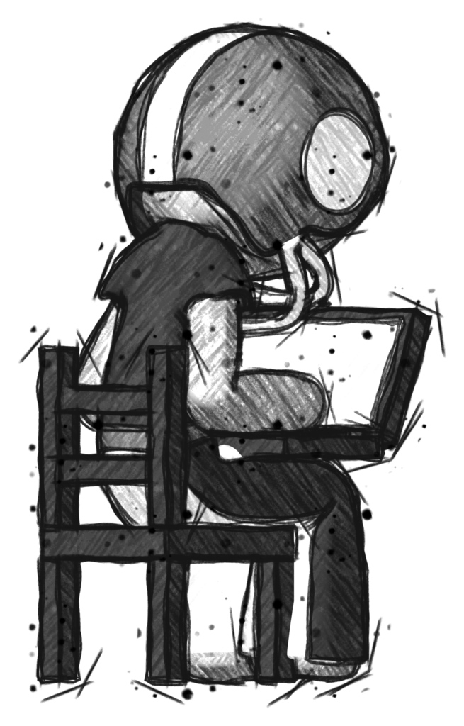 Sketch Football Player Man using laptop computer while sitting in chair view from back