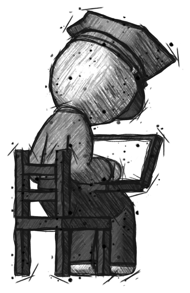 Sketch Police Man using laptop computer while sitting in chair view from back Keywords: police, policeman, officer, computer, laptop, technology, Pencil Drawing, security, uniform, hat, badge, cop, guard, justice, patrol, business, internet, character, pc, communication, web, screen, wireless, keyboard, online, notebook, concept, hacker, user, chair, sitting, resting, working, seat, seated, male, man, Drawing, Sketch, Art, Sketchy, Line, Doodle, Drawn, Stroke, Illustration
