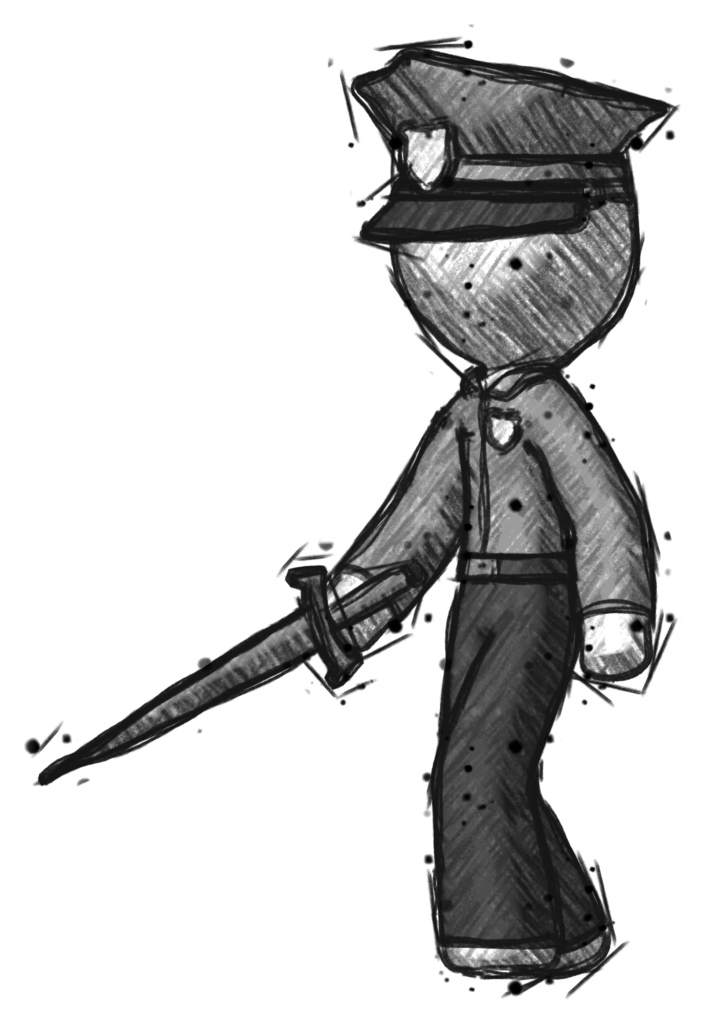 Sketch Police Man with sword walking confidently Keywords: police, policeman, officer, dagger, sword, medieval, Pencil Drawing, security, uniform, hat, badge, cop, guard, justice, patrol, white, roman, ancient, knife, blade, old, weapon, short, metal, steel, sharp, silver, traditional, history, war, fight, battle, warrior, fighter, gladiator, male, man, Drawing, Sketch, Art, Sketchy, Line, Doodle, Drawn, Stroke, Illustration