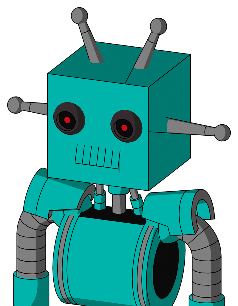 Greenish Robot With Box Head And Toothy Mouth And Black Glowing Red Eyes And Double Antenna