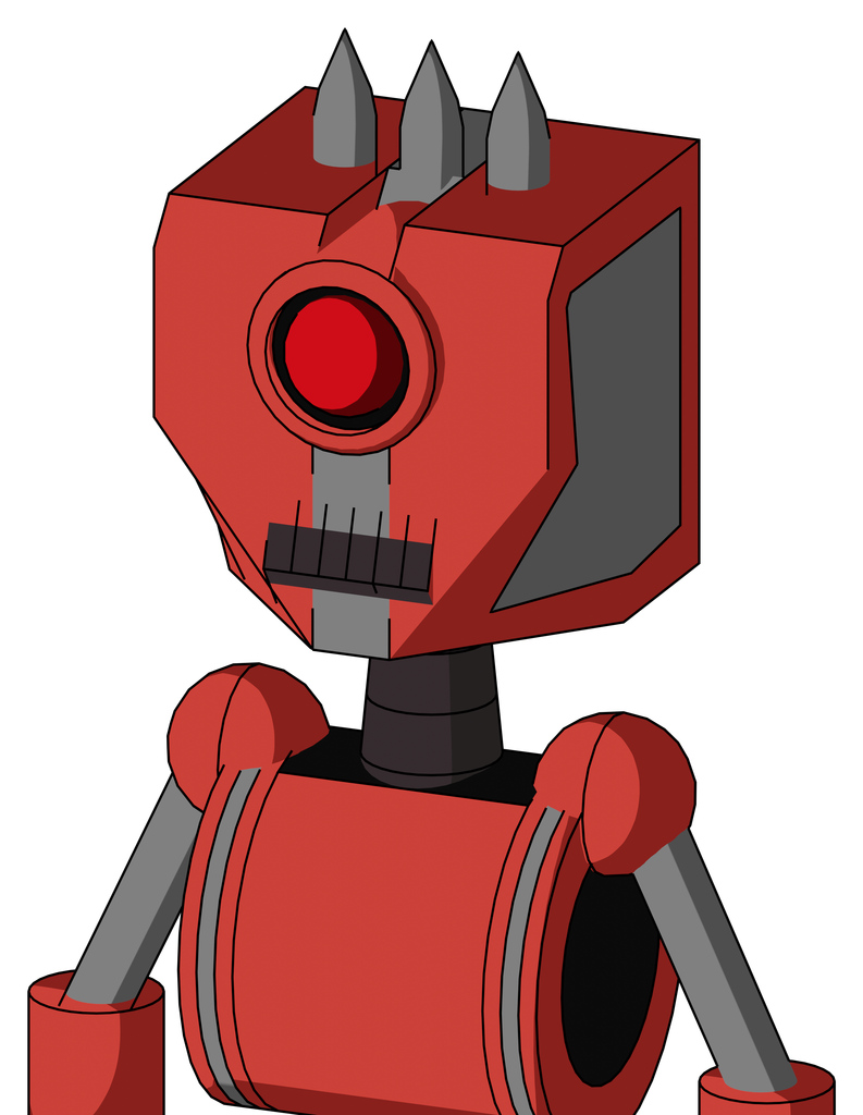 Tomato-Red Droid With Mechanical Head And Dark Tooth Mouth And Cyclops Eye And Three Spiked