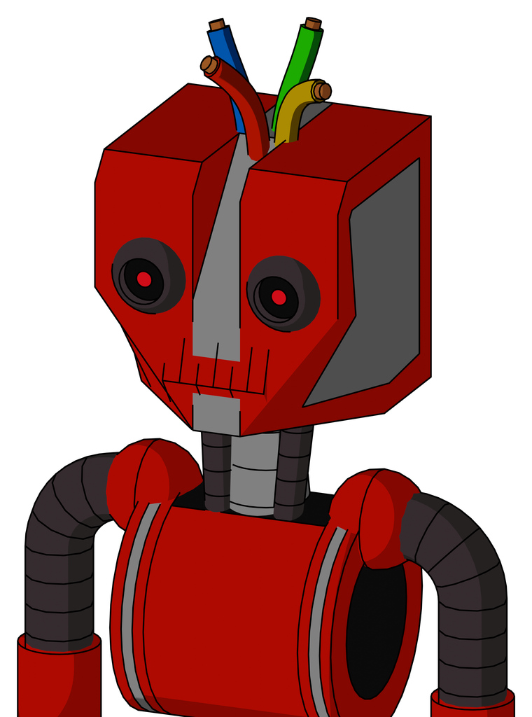 Red Mech With Mechanical Head And Toothy Mouth And Black Glowing Red Eyes And Wire Hair