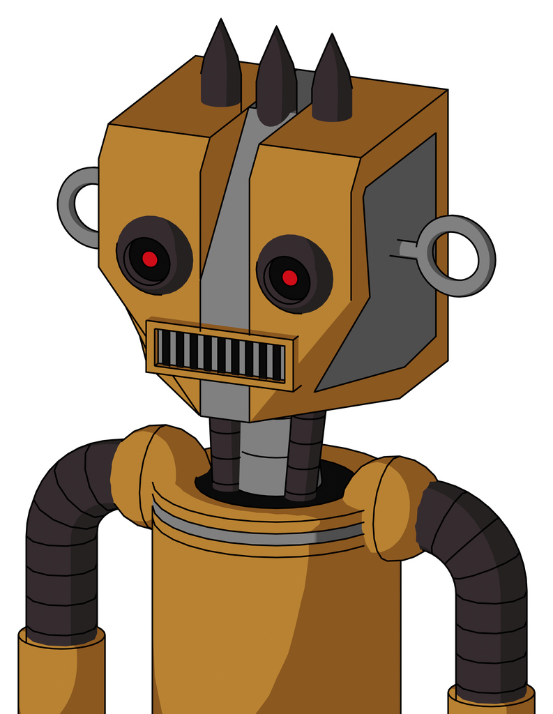 Yellowish Droid With Mechanical Head And Square Mouth And Black Glowing Red Eyes And Three Dark Spikes