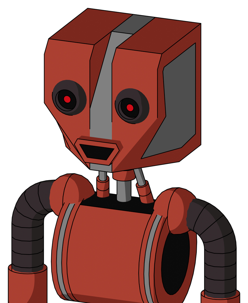 Red Automaton With Mechanical Head And Happy Mouth And Black Glowing Red Eyes