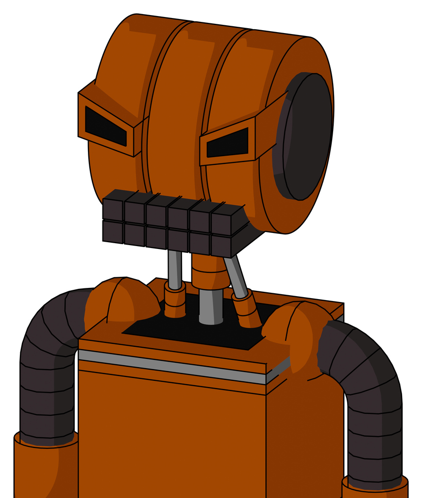 Redish-Orange Mech With Multi-Toroid Head And Keyboard Mouth And Angry Eyes