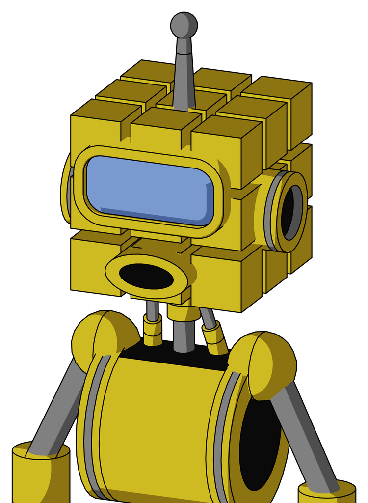 Yellow Droid With Cube Head And Round Mouth And Large Blue Visor Eye And Single Antenna