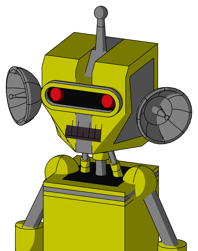 Yellow Robot With Mechanical Head And Dark Tooth Mouth And Visor Eye And Single Antenna