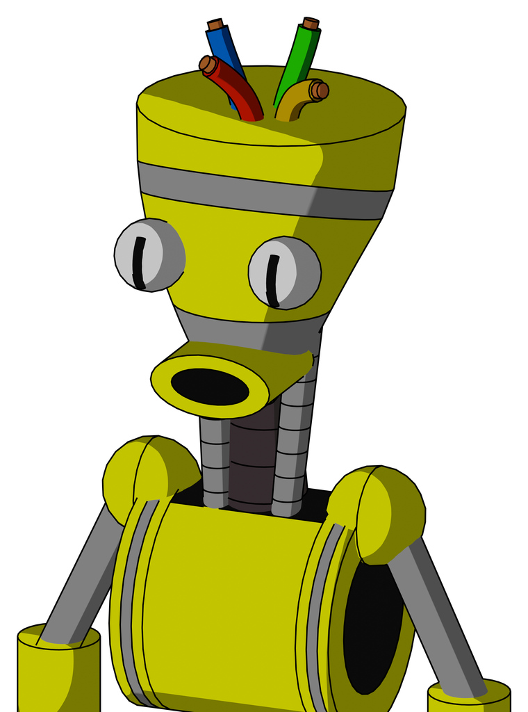 Yellow Robot With Vase Head And Round Mouth And Two Eyes And Wire Hair