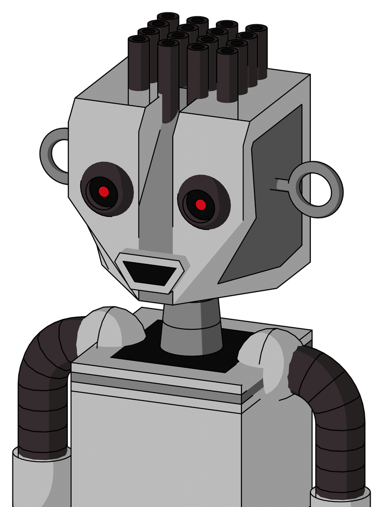 White Automaton With Mechanical Head And Happy Mouth And Black Glowing Red Eyes And Pipe Hair