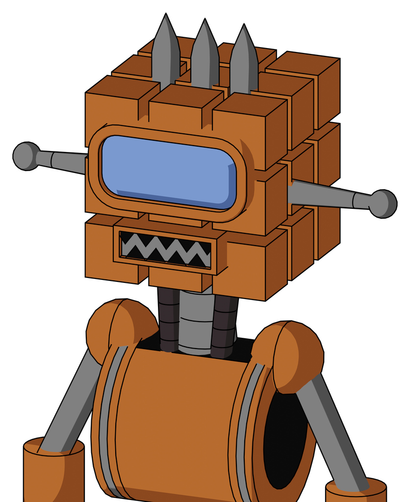 Orange Robot With Cube Head And Square Mouth And Large Blue Visor Eye And Three Spiked