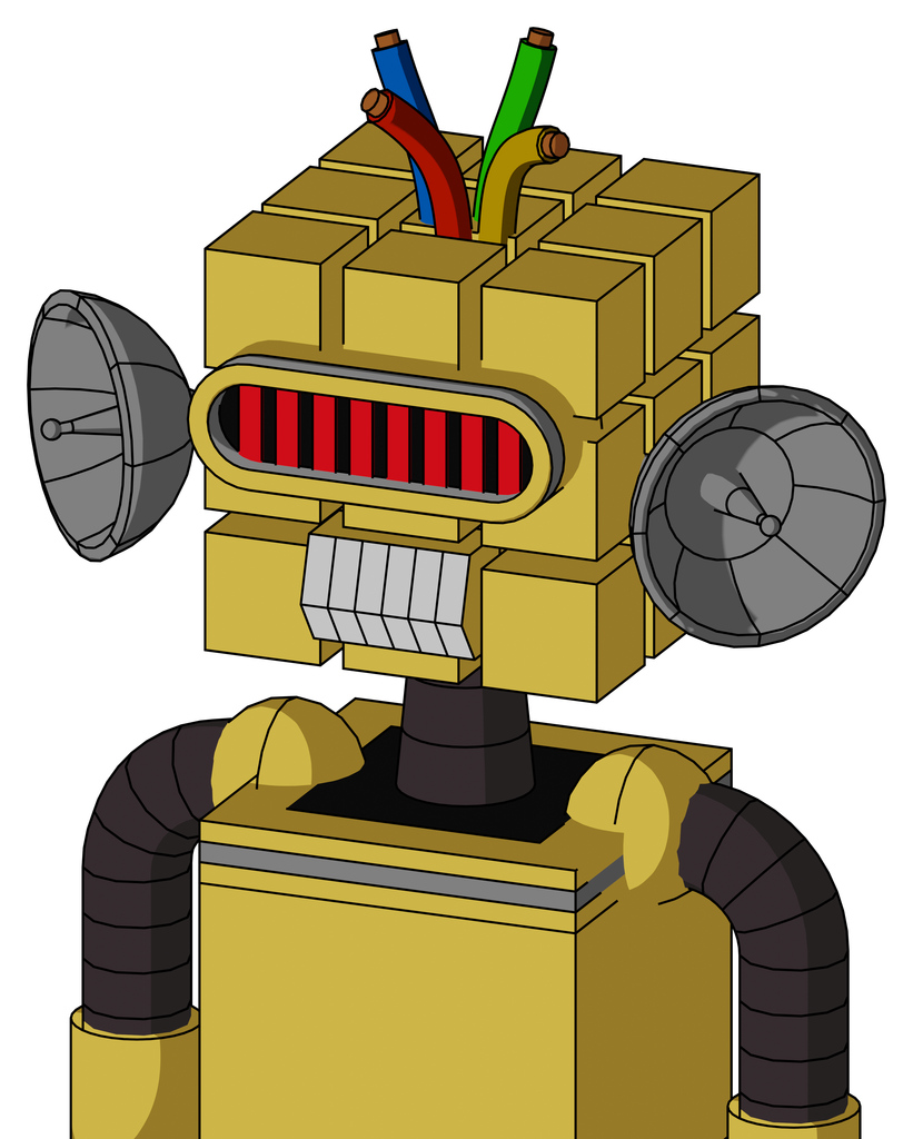 Yellow Droid With Cube Head And Teeth Mouth And Visor Eye And Wire Hair