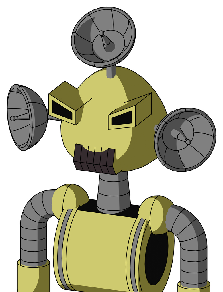 Yellow Robot With Rounded Head And Dark Tooth Mouth And Angry Eyes And Radar Dish Hat