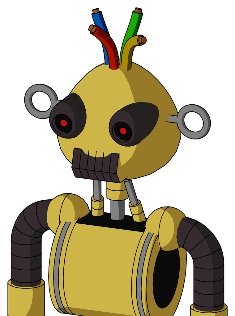 Yellow Droid With Rounded Head And Dark Tooth Mouth And Black Glowing Red Eyes And Wire Hair